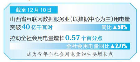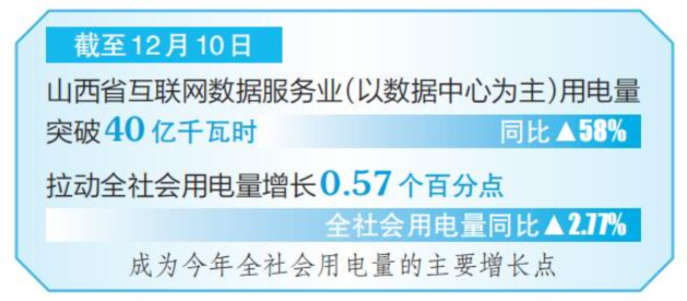 日前,国网山西省电力公司经济技术研究院发布了《山西省电力算力协同发展研究报告》,报告显示,截至12月10日,山西省互联网数据服务业(以数据中心为主)用电量突破40亿千瓦时,同比增长58%,拉动全社会用电量增长0.57个百分点(全社会用电量同比增长2.77%),成为今年全社会用电量的主要增长点。