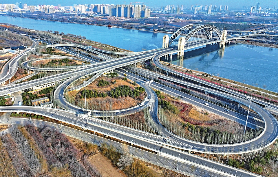 1月18日,阳光明媚。鸟瞰省城横跨汾河东西两岸的晋阳桥,其设计集古典风格与现代韵味于一体,体现了人、建筑与城市的互动融合。造型典雅别致的桥梁如同一把随风弹奏惬意旋律的竖琴,演奏着晋阳独特的冬日韵味。(记者刘通摄)