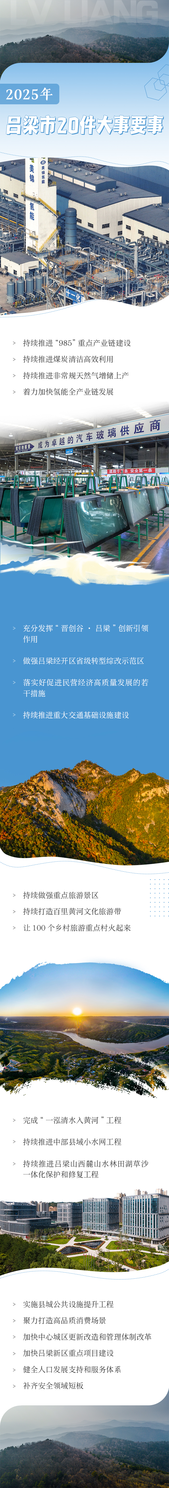 2025年吕梁市推动高质量发展的20件大事要事中,既有持续推进煤炭清洁高效利用、持续推进重大交通基础设施建设、持续做强重点旅游景区等2024年未完成的或需要长期推进的事项,也有充分发挥“晋创谷·吕梁”创新引领作用、做强吕梁经开区省级转型综改示范区等新的部署事项。