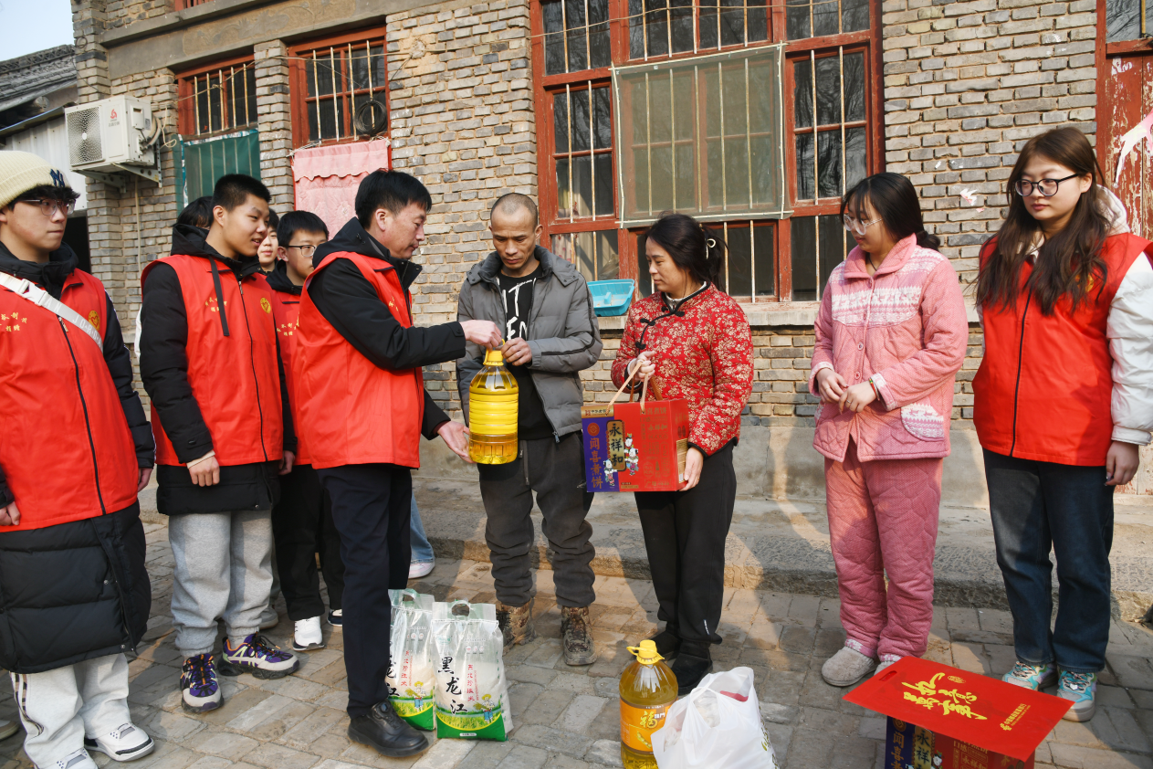 在志愿者的带领下,大学生们分四组进村入户,为七个乡镇的十余户残障者送去由煮饼、大米、食用油、饺子、对联等组成的“十喜”春节大礼包,表达对他们的节日祝福。