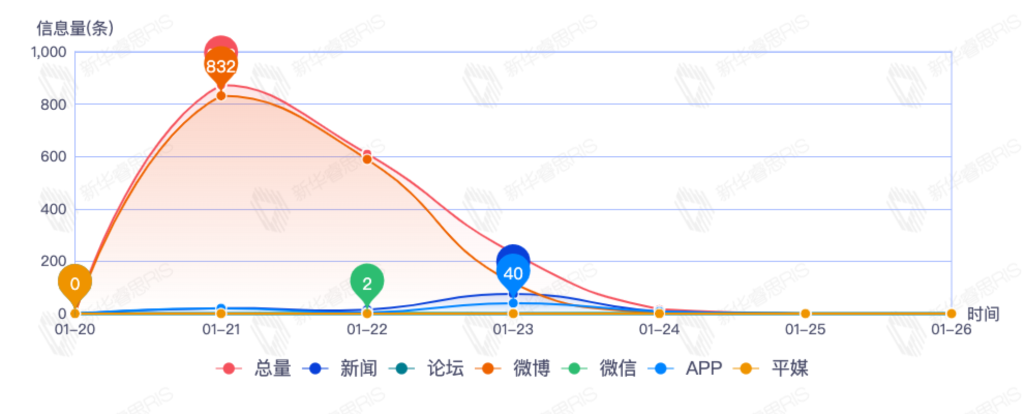 截至目前,该文章在互联网上传播总量共1678篇。其中,1月23日是传播的高峰期,共传播971篇文章。各信源的信息发布情况中,微博信息占比最大,其次是新闻和APP,信息量分别为1345、139、79,占比分别为85.89%、8.88%、5.04%。(数据来源:新华睿思·数媒智慧分析平台)