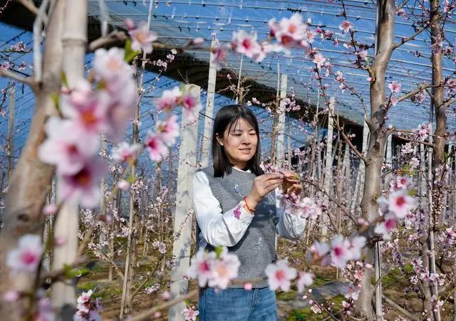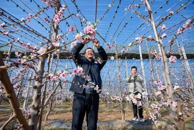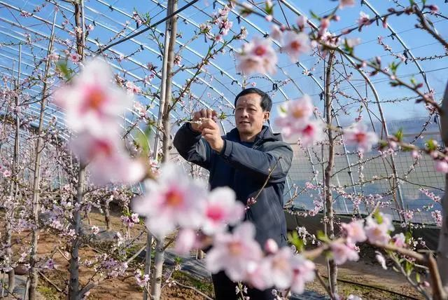 立春时节,运城市万荣县通化镇西孝原村设施大棚内春意盎然,桃花灼灼。种植户在桃树间穿梭忙碌,有条不紊地进行疏花、授粉、剪枝等工作,为新一年稳产增收奠定基础。
