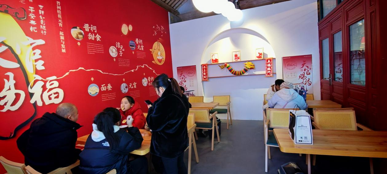 走进晋阳文食体验店,可以看到店内不仅有传统煮元宵,还有更符合年轻人口味的浮桂、酥山冰宵、桂花珍珠糍粑、上元油锤等,在场顾客称赞连连。同时,在这里可以参观了解元宵起源和制作流程技艺,每天元宵销量超15000颗。