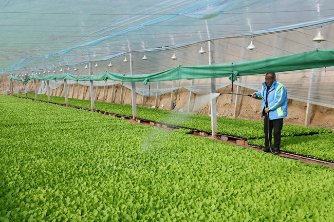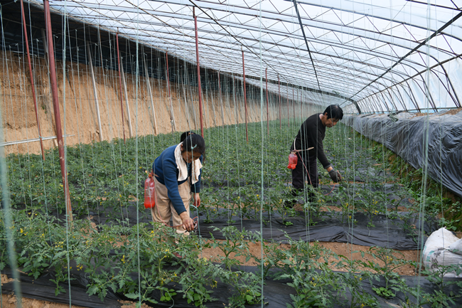 闻喜县后宫乡阳庄村村民正在大棚里管理西红柿苗。