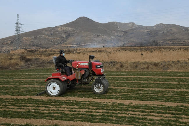 农机手正在闻喜县后宫乡上院村旱地小麦基地碾压小麦苗。