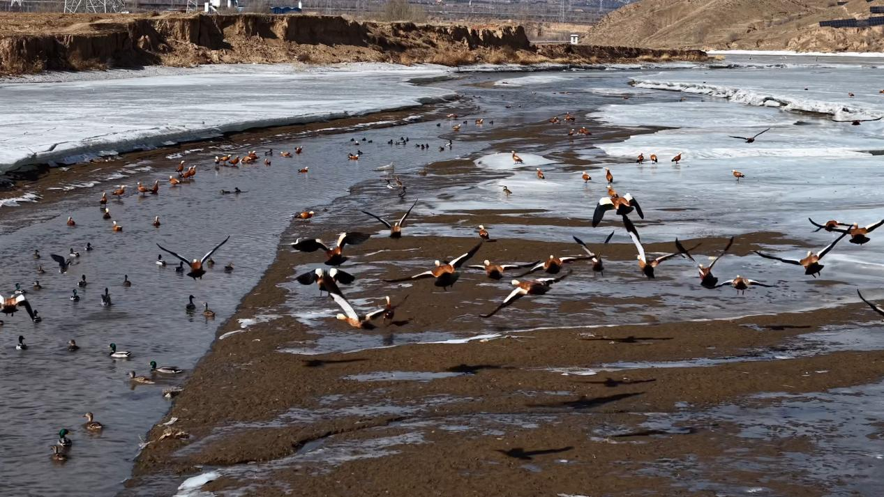 沿着洋河,赤麻鸭群日常进行觅食等活动,在空中翱翔,呈现一派生机勃勃的景象。据介绍,每年春季,赤麻鸭便从南方越冬地飞往北方,南洋河湿地是它们迁徙途中的重要停歇地,为赤麻鸭提供能量补给和短暂休憩的场所。