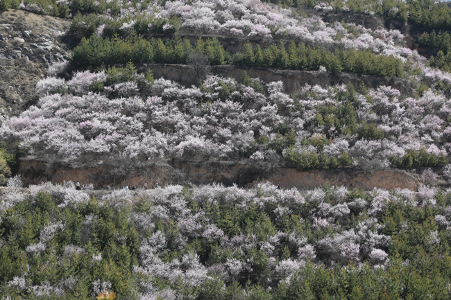 山桃花一团团、一簇簇,沿着山势蜿蜒分布。