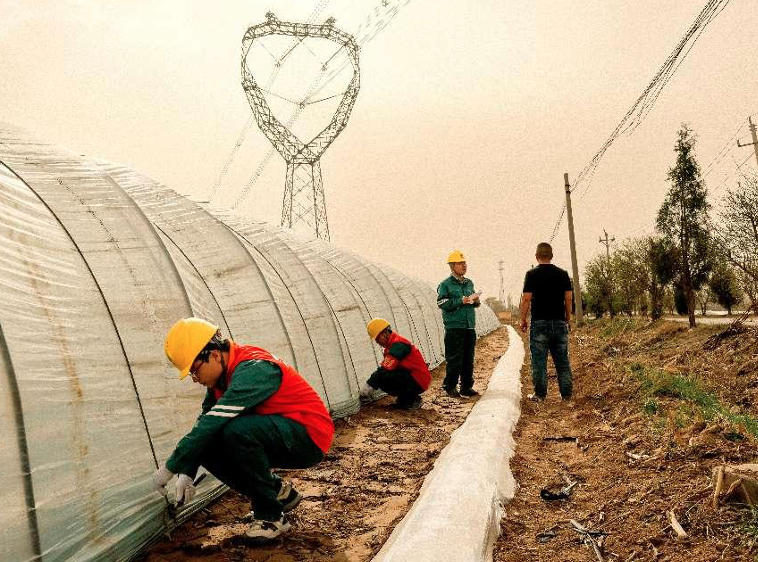 4月11日,在忻州市忻府区九源街道,国网山西超高压输电公司共产党员青年突击队队员针对强对流大风天气,结合实际情况,查看超特高压线下大棚安全状况,并对异物隐患区域加强巡检,叮嘱彩钢房和大棚户主加强防护,同时开展防火宣传、电力服务等工作,确保电网设备安全稳定。(杜衡 摄)