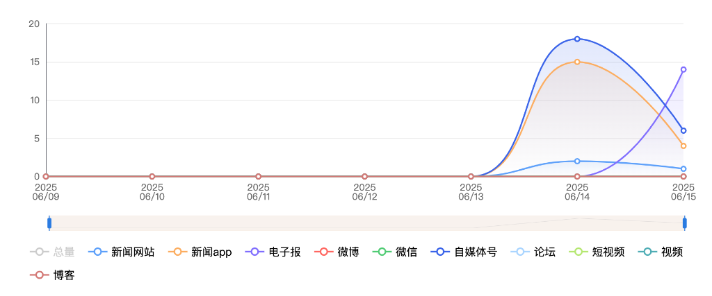 截至目前,该文章在互联网上传播总量共60篇。其中,6月14日是传播的高峰期,共传播35篇文章。各信源的信息发布情况中,自媒体号占比最大,其次是APP和电子报,占比分别为40%、31.67%、23.33%。(数据来源:新华睿思·数媒智慧分析平台)