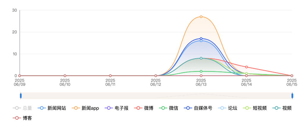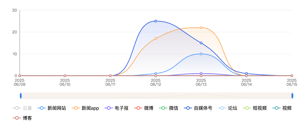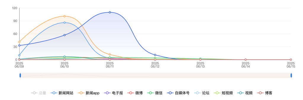 截至目前,该文章在互联网上传播总量共511篇。其中,6月11日是传播的高峰期,共传播126篇文章。各信源的信息发布情况中,自媒体号占比最大,其次是APP和新闻网站,占比分别为41.29%、30.72%、19.57%。(数据来源:新华睿思·数媒智慧分析平台)