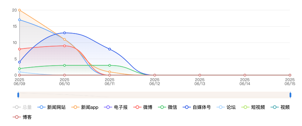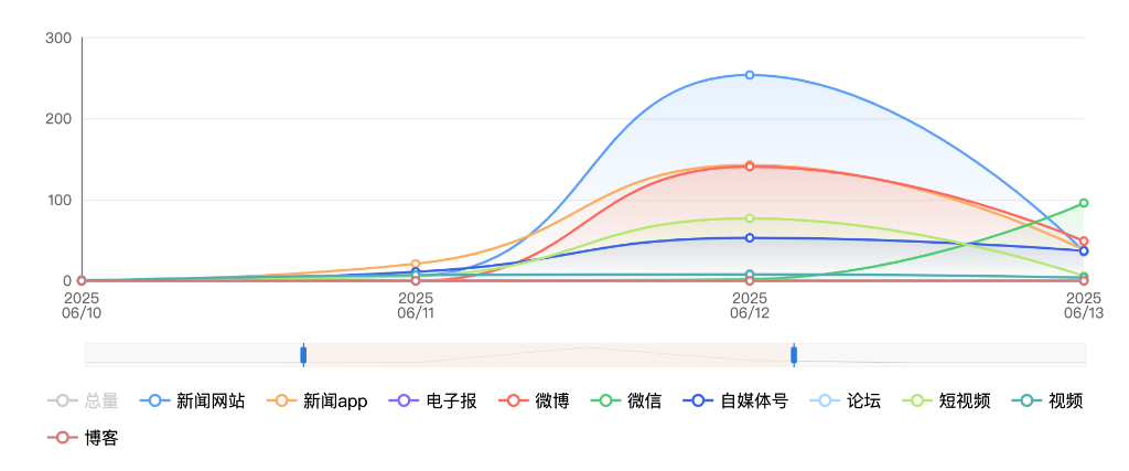 截至目前,该文章在互联网上传播总量共199篇。其中,6月11日是传播的高峰期,共传播95篇文章。各信源的信息发布情况中,自媒体号占比最大,其次是APP和新闻网站,占比分别为44.72%、34.67%、15.08%。(数据来源:新华睿思·数媒智慧分析平台)