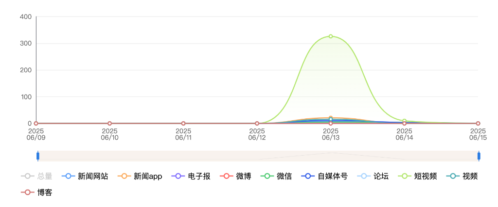 截至目前,该文章在互联网上传播总量共404篇。其中,6月13日是传播的高峰期,共传播386篇文章。各信源的信息发布情况中,短视频占比最大,其次是APP和视频,占比分别为83.17%、5.2%、3.96%。(数据来源:新华睿思·数媒智慧分析平台)