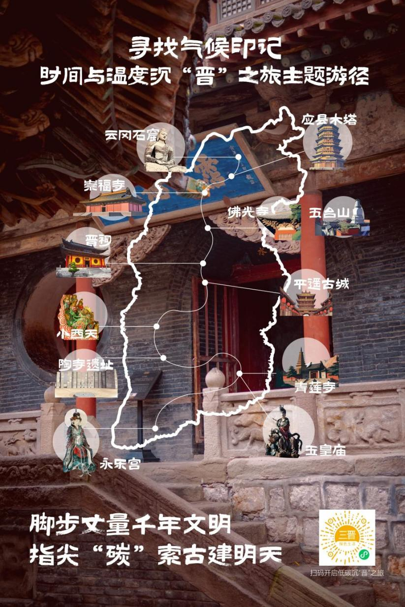 北起云冈石窟、南至永乐宫,这一主题游径用气候变化串联起山西省12处具有代表性的文化遗产,沿线包括应县木塔、崇福寺、五台山、佛光寺、晋祠、平遥古城、小西天、陶寺遗址、青莲寺、玉皇庙,通过“文化遗产+低碳守护”模式,构建气候变化背景下文化遗产保护与绿色发展的创新路径。