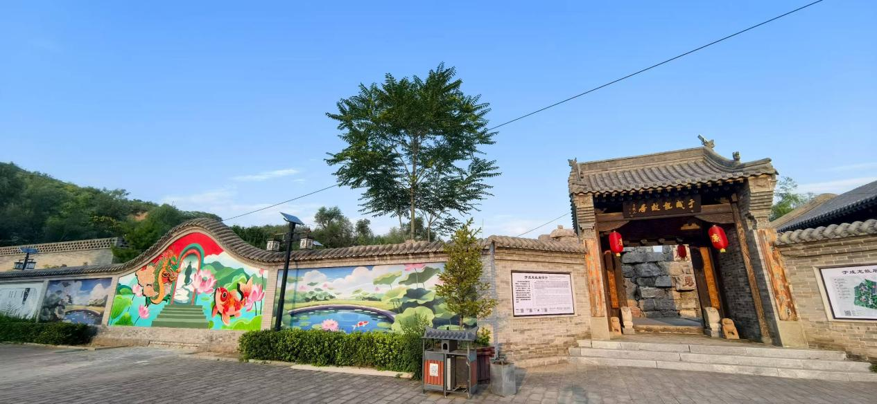 走进文化园内,一面充满艺术气息的墙绘映入眼帘。画面中一条栩栩如生的龙和一条金鱼隔拱门相望,巧妙呈现“鱼跃龙门”的意象。拱门内,是于成龙遥望山河的背影,背景则是盛开的莲花与翠绿的莲叶,整个画面生机盎然。