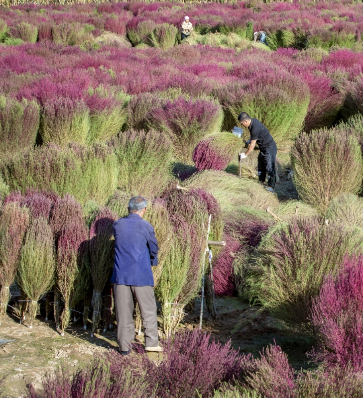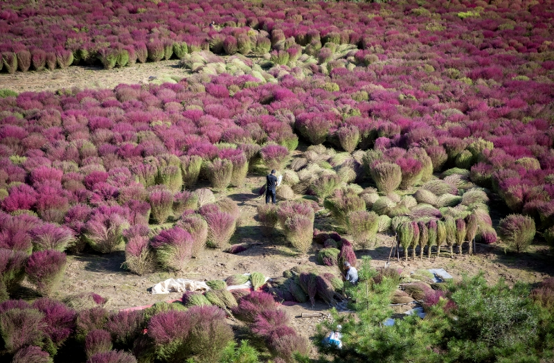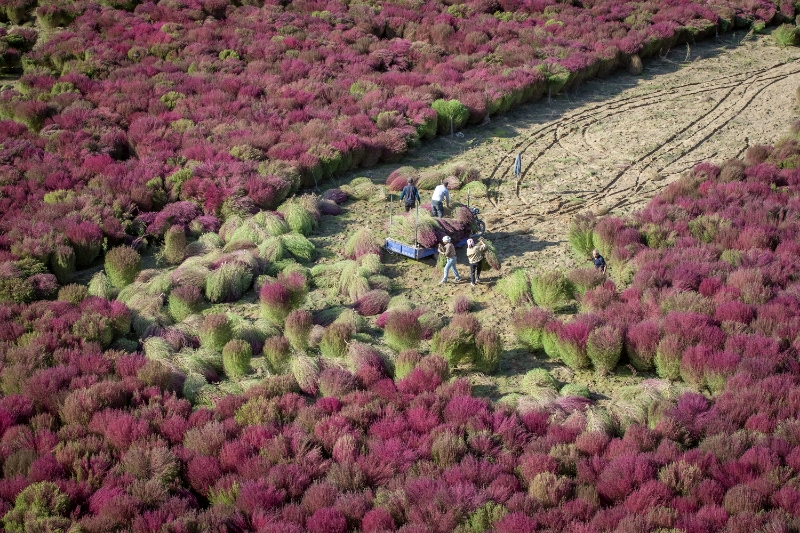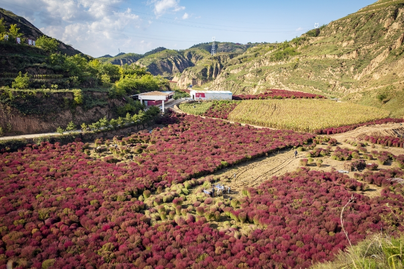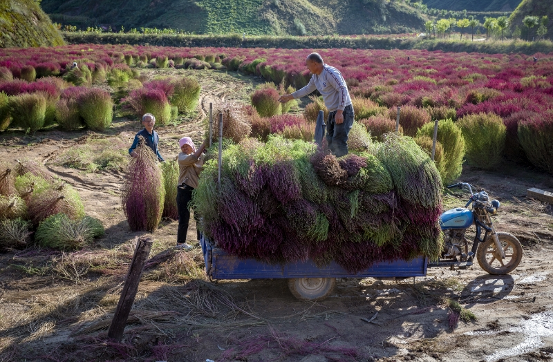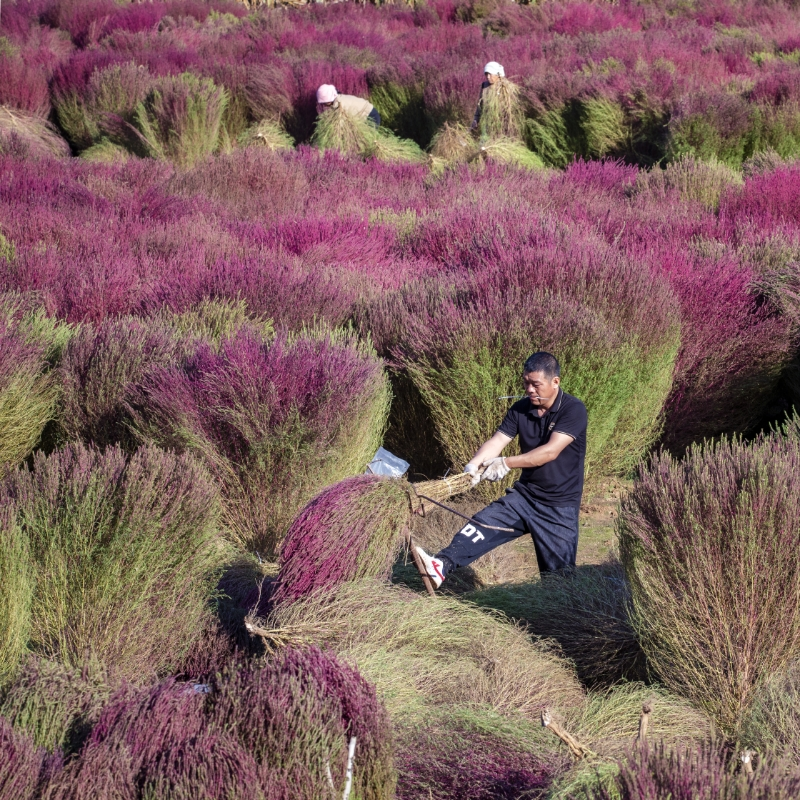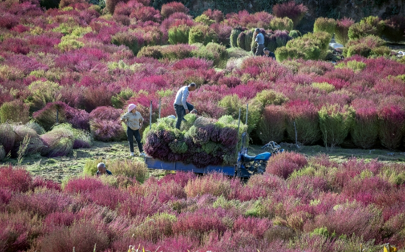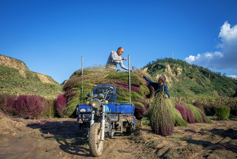 秋分时节,吕梁市柳林县贾家垣乡曹家沟村的特色种植基地迎来丰收。漫山遍野的扫帚草,红、黄、绿交织,形成一幅绚丽画卷。村民们穿梭其中,收割捆扎,脸上洋溢着喜悦。