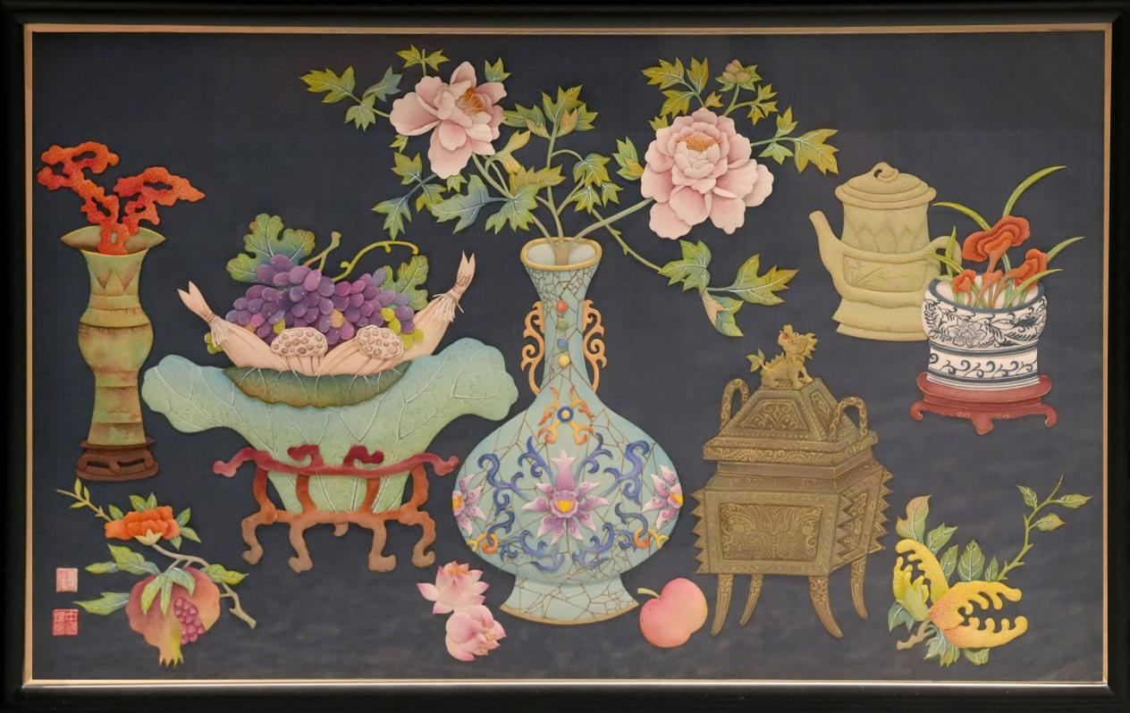 上党堆锦俗称“长治堆花”,是一门有着千年历史的立体丝绸艺术,融合地方文化,终成独具特色的民间技艺。堆锦制作工艺繁复,需经设计底稿、分解图样、剪裁丝绸、贴飞边、压纸捻、絮棉花、拨硬折等十余道工序。工匠以硬板纸和棉花为骨架,外包丝绸锦缎,通过精细的手工拼贴、堆叠,创造出层次分明、栩栩如生的浮雕效果,被誉为“立体国画”。2008年,堆锦(上党堆锦)被列入第二批国家级非物质文化遗产名录。
