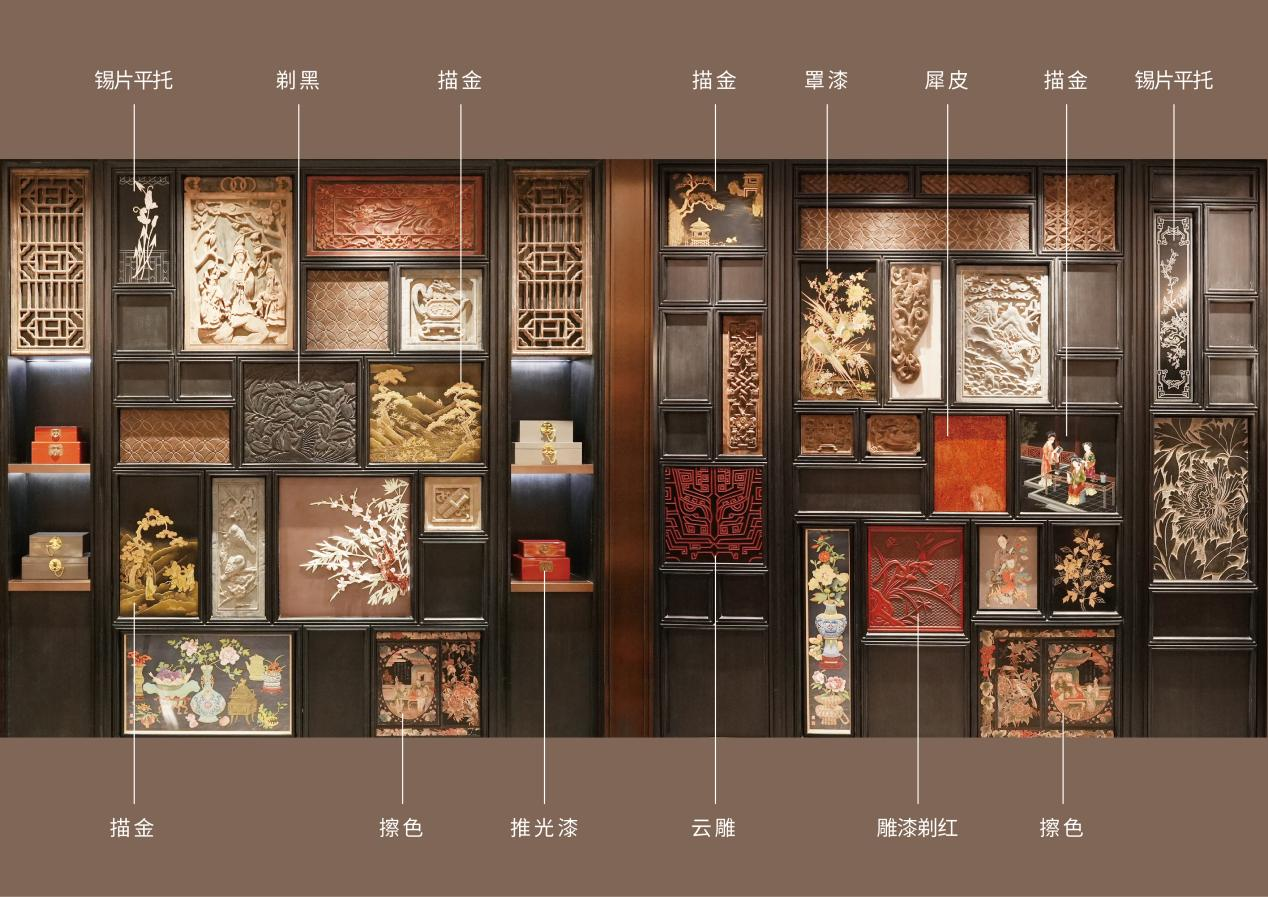 在中国传统漆器工艺的绚丽长河中,平遥推光漆虽为集大成者,其他传承千年的漆艺技法亦在当代焕发流光溢彩的生命力。晋泽昌文旅酒店在散台区精心汇聚描金、罩漆、云雕、剃黑、犀皮、擦色、雕漆剃红、锡片平托八大核心漆艺技艺,让宾客在方寸之间亲历中国漆艺从“庙堂之高”走向“人间烟火”的千年演进史诗。