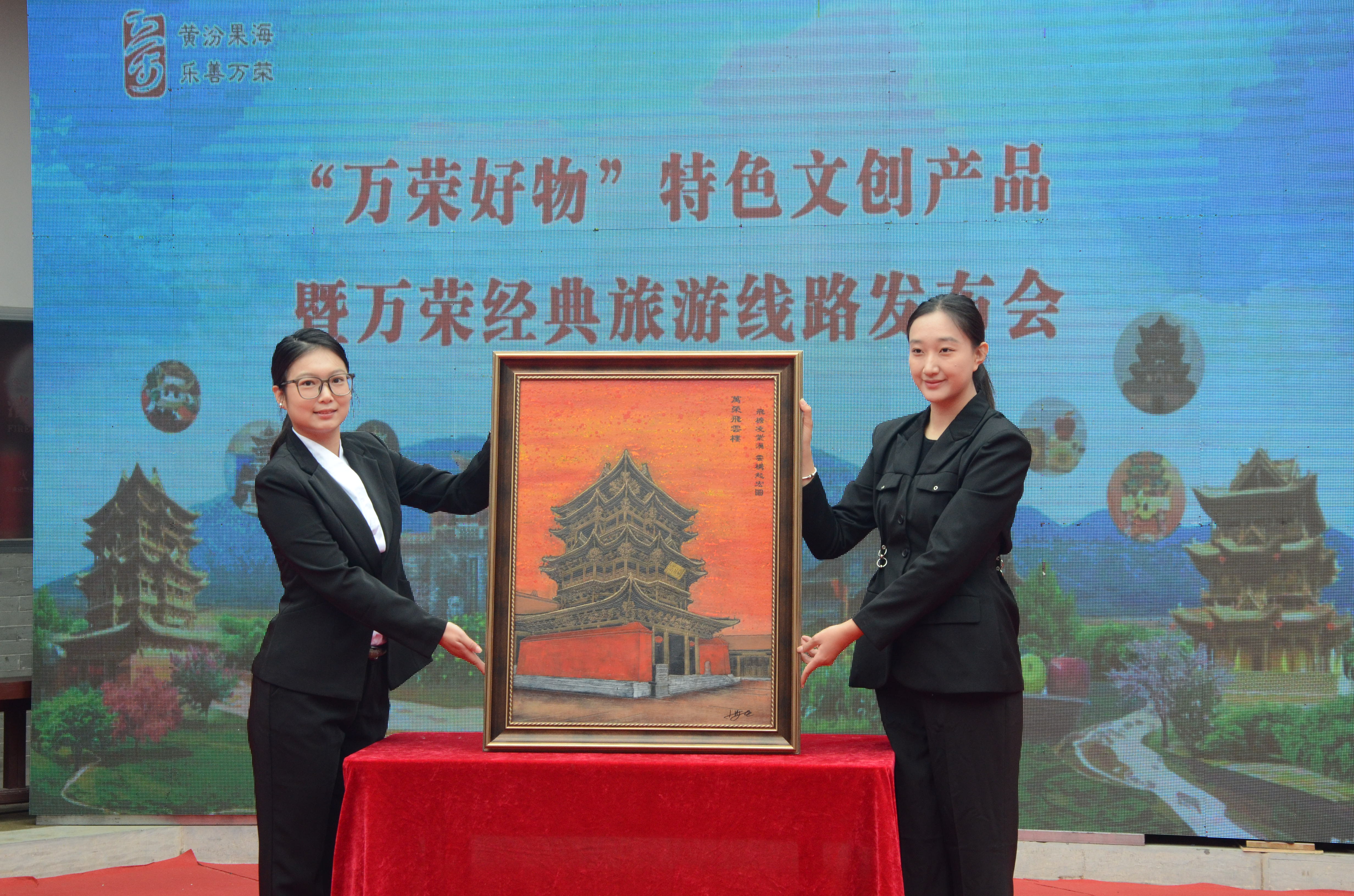 发布会上,10款文创好物依次亮相。以“中华第一木楼”飞云楼为灵感的“荣飞飞”音乐挂件,融合建筑文化与苹果元素,拉铃设计萌趣又暖心;“万果果”以苹果为造型,头戴飞云楼帽,活泼可爱;“柿柿如意”毛绒玩具以磁吸设计寓意“好事成双”,传递温馨祝福;秋风楼坛门石雕卷轴再现石刻艺术,古朴典雅;飞云楼磨漆画通过绘画语言,还原木构建筑之美;盘龙石柱浮雕冰箱贴以立体造型展现传统石雕;DIY立体拼图在挑战中体悟营造法式的精妙;万荣铜苹果以铜雕工艺传递平安寓意;万荣名人面塑将历史人物非遗化呈现;虎头抱被则融合传统工艺与实用功能,传递吉祥祝福。这些产品将万荣地域元素与现代审美、实用功能巧妙结合,成为“可以带走的万荣记忆”。