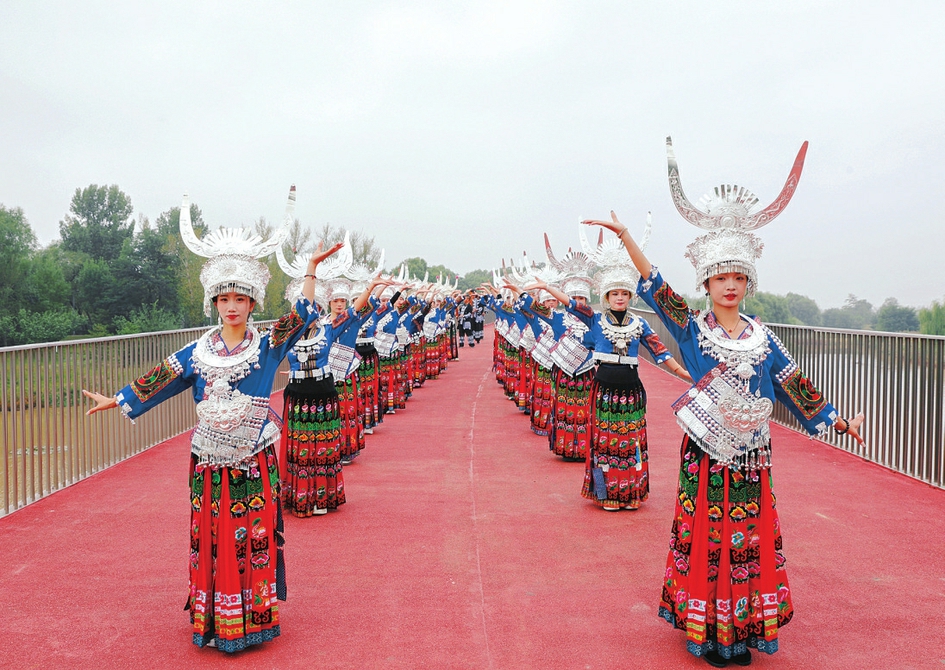 10月2日9时许,一曲高亢的苗族飞歌点燃了现场的气氛。景区入口处,百余名来自贵州的苗族演员身着精美的传统盛装,以苗族同胞对来客最崇高敬意的“拦门酒”仪式欢迎八方来客。银饰闪烁,鼓声激昂,欢快的踩鼓舞、互动十足的竹竿舞等接连上演,令人目不暇接。