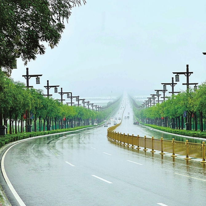 雨雾蒙蒙,从006号灯杆望去,盐湖、中条山与城市浑然一体。