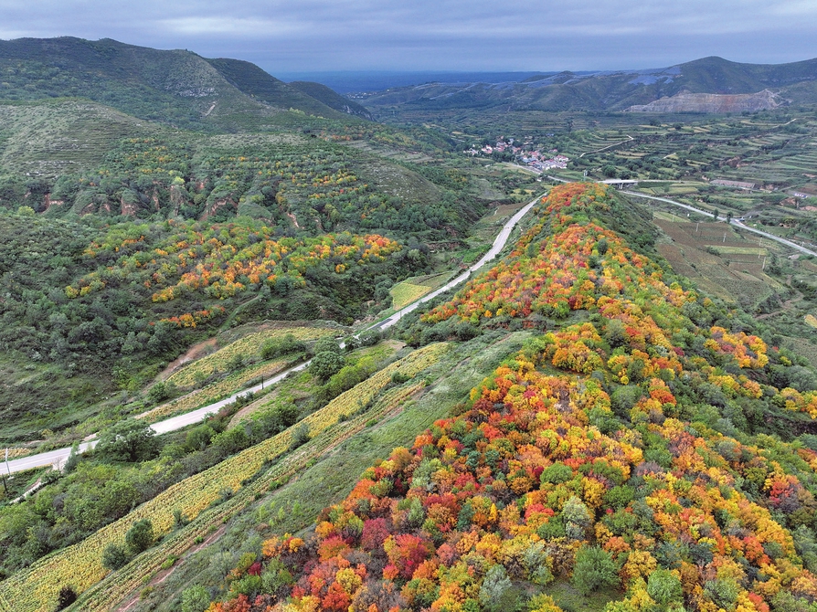 10月8日,航拍镜头下,武乡县蟠龙镇安乐庄村附近,蜿蜒的公路与红、黄、绿交织的山林构成一幅色彩斑斓的深秋画卷。(李勇摄)