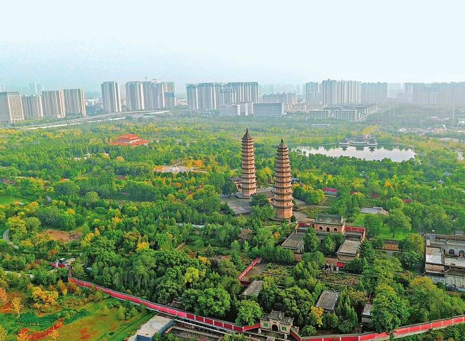 10月13日,秋日的太原市双塔公园层林尽染,色彩斑斓。双塔巍峨耸立,湖水澄澈如镜,园内步道蜿蜒,尽显秋日的诗意与静谧。