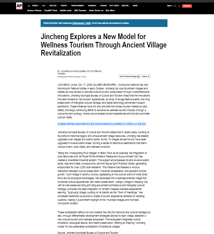 山西省晋城市依托深厚的历史文化底蕴与独特的古村落资源赋能文旅康养产业的生动实践,受到美联社、日本共同社、韩联社等多家海外媒体关注。来自欧美、亚太和非洲地区20个国家的1210家海外媒体、网站等对其进行了刊发转载。