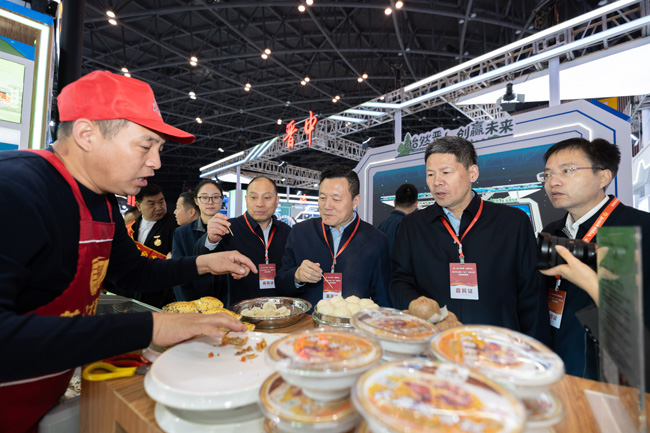 参会人员在运城展区品鉴美食。