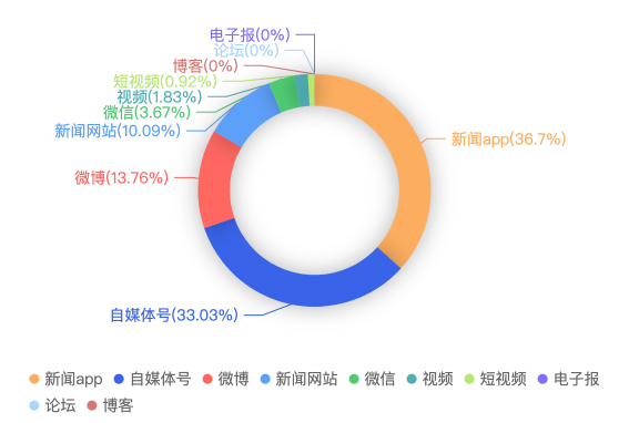 截至目前,该文章在互联网上传播总量共98篇。各信源的信息发布情况中,微博和新闻APP占比最大,其次是自媒体号。(数据来源:新华睿思·数媒智慧分析平台)