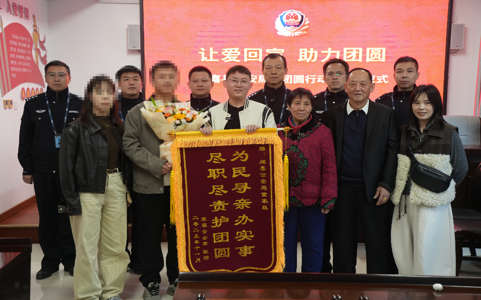 11月6日,山西省闻喜县东镇居民宋先生一家来到闻喜县公安局,将一面印有“为民寻亲办实事,尽职尽责护团圆”的锦旗送到刑侦大队办案民警手中,感谢闻喜公安为其找到丢失34年的儿子。