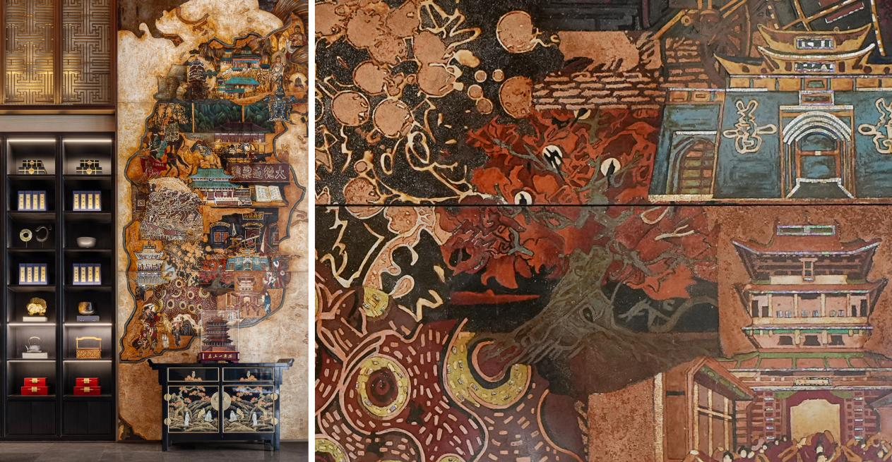 步入酒店大堂,国家级非遗传承人薛生金先生创作的推光漆画《锦绣晋境》映入眼帘。作品巧妙串联起山西文化地标,画中那棵枝繁叶茂的大槐树,正是洪洞槐影的艺术再现。
