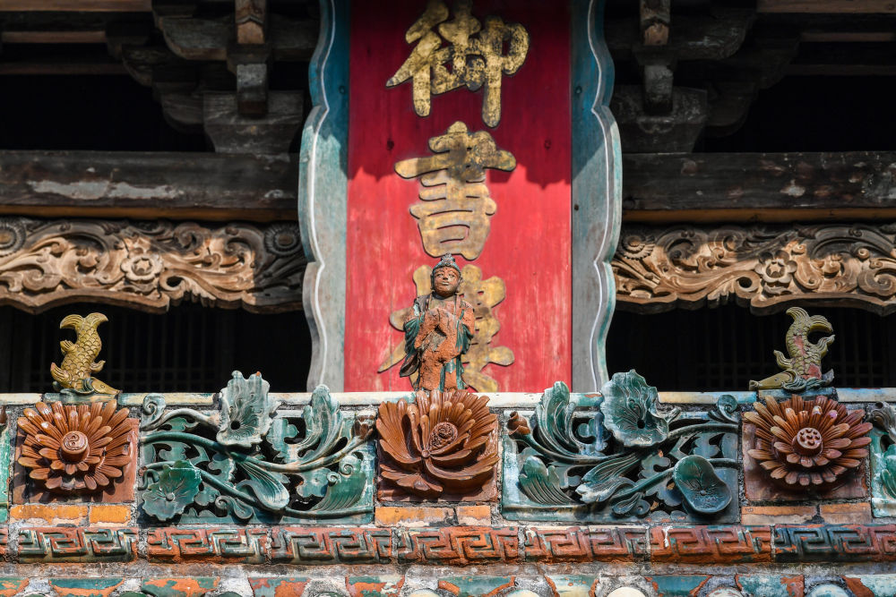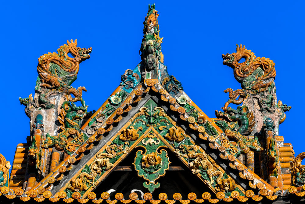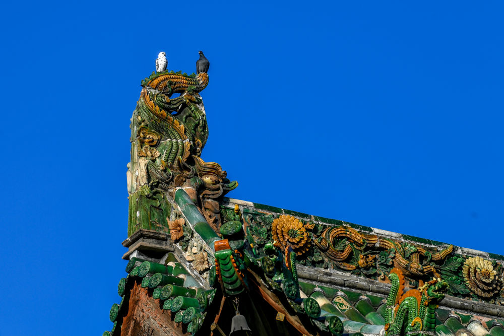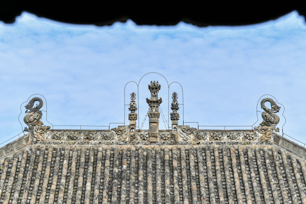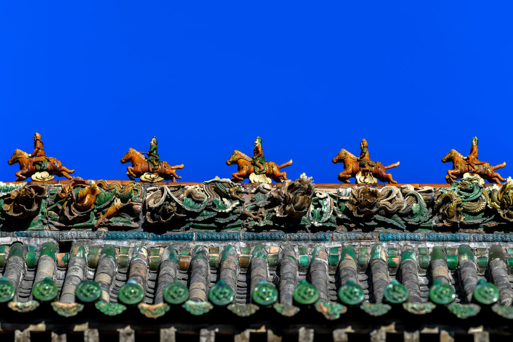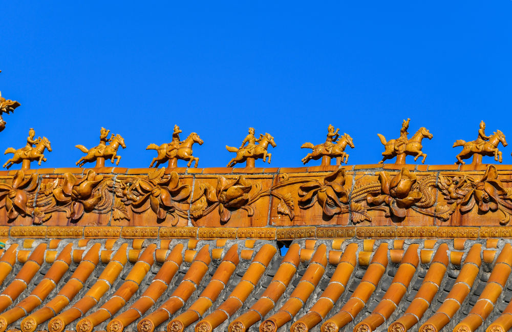 这是11月14日在山西省运城市解州关帝庙拍摄的古建顶上的装饰构件。