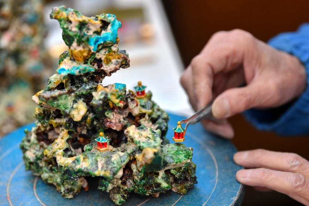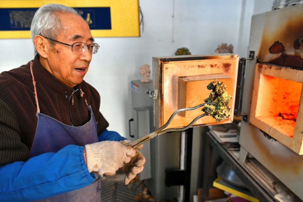 琉璃烧制技艺国家级非遗代表性传承人葛原生在位于山西省太原市的工作室里制作琉璃工艺品。记者:曹阳