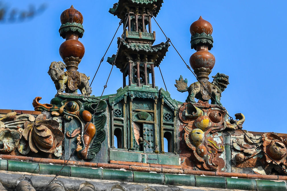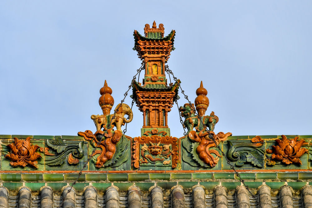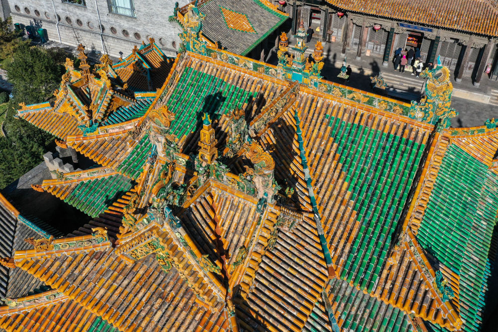 这是11月18日在山西省介休市后土庙拍摄的古建顶上的装饰构件。孔雀蓝、翡翠绿、琥珀黄……