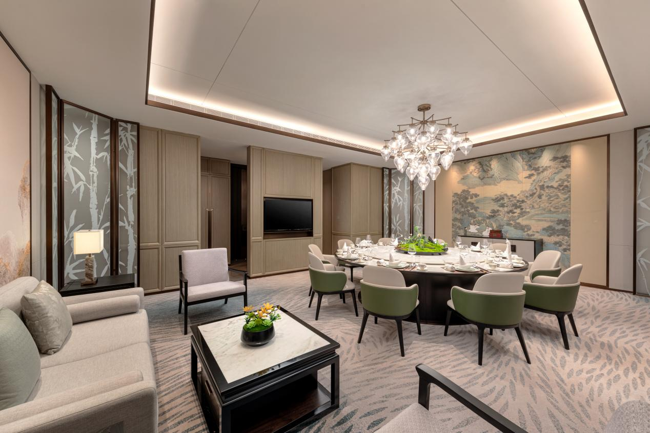 步入晋御轩中餐厅的贤才厅,清雅的竹节元素映入眼帘。墙面以层层竹节为装饰视觉焦点,恰如荀子所言“不积跬步,无以至千里”,巧妙隐喻着厚积薄发的成才智慧。
