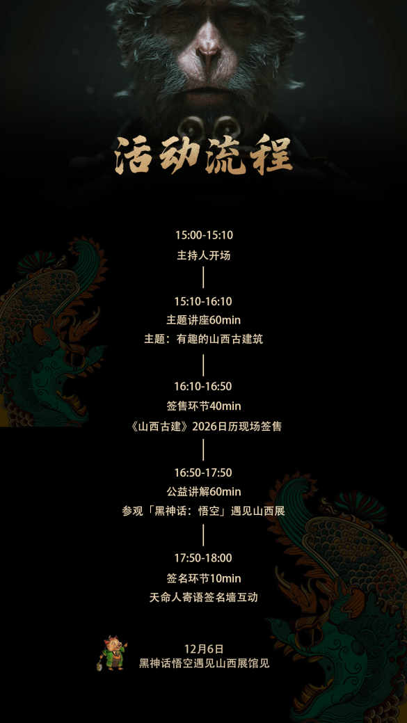 此次文化沙龙以山西古建文化为切入点,借助「黑神话:悟空」遇见山西展,为游客与文化博主搭建交流平台,激发公众对山西古建文化的关注与热爱。分享结束后,杨大炜还将在现场进行日历签售与公益讲解,与游客近距离互动。