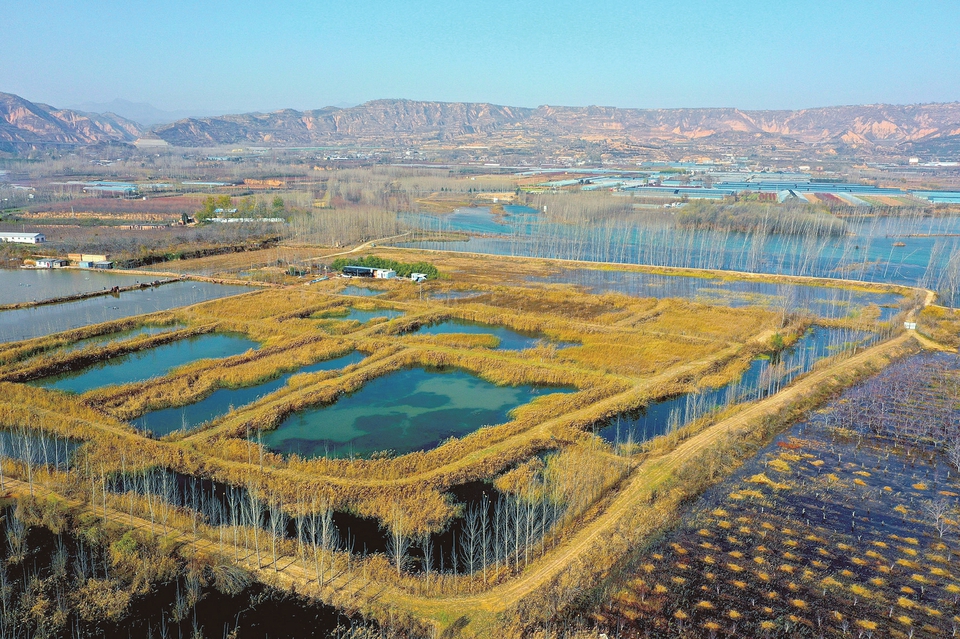 12月3日,俯瞰平陆县黄河湿地,金黄的林木或立于水岸、或探入水中,道路点缀其间,呈现出一幅壮美的生态湿地画卷。近年来,当地持续实施沿黄“百里生态廊道”建设与湿地生态修复工程,使生态环境持续向好。(郝健摄)