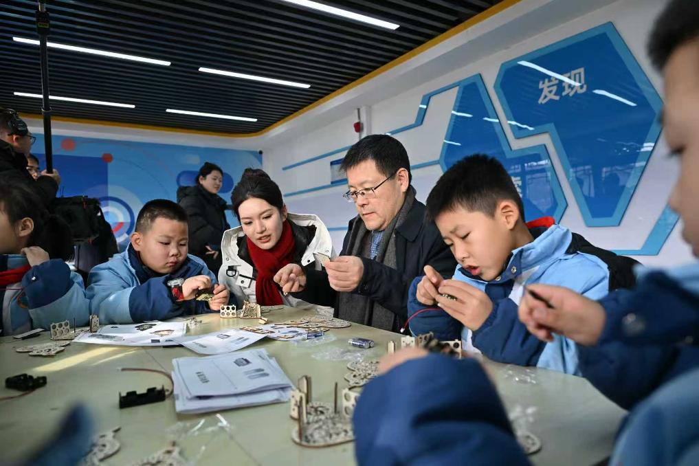 在王营庄文旅科创小镇,秦朔与小朋友们一起动手实践。