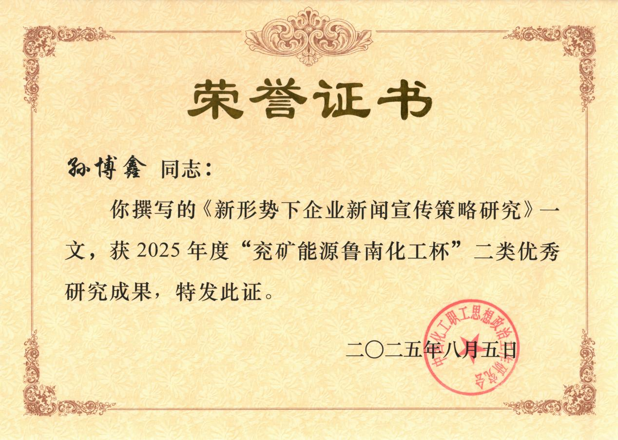 据介绍,本次发布活动共收到研究成果372篇,经专家综合评审,发布一类研究成果42篇,二类研究成果71篇,三类研究成果129篇。中国化学二化建职工孙博鑫撰写的论文《新形势下企业新闻宣传策略研究》荣获“兖矿能源鲁南化工杯”二类优秀研究成果,麻海霞、高雅珍荣获“优秀通联工作者”。