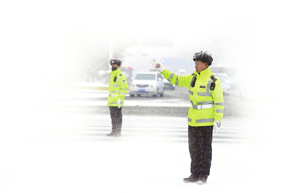 12月12日,太原市迎泽大街新建路口交警正进行交通疏导。记者赵夏雨摄