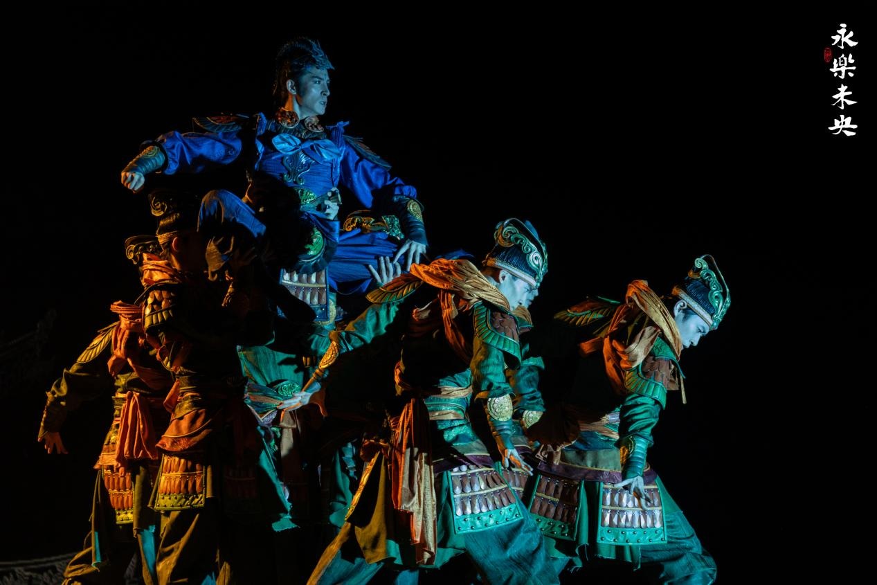 舞台上,备受赞誉的“藻井团龙”群舞以精妙的队形变幻与手臂交叠,复现出古建筑斗拱层叠的美。而“迁建者群舞”则以充满力量感的群体动作,再现了当年青年建设者们托举榫卯彩画的众志成城。