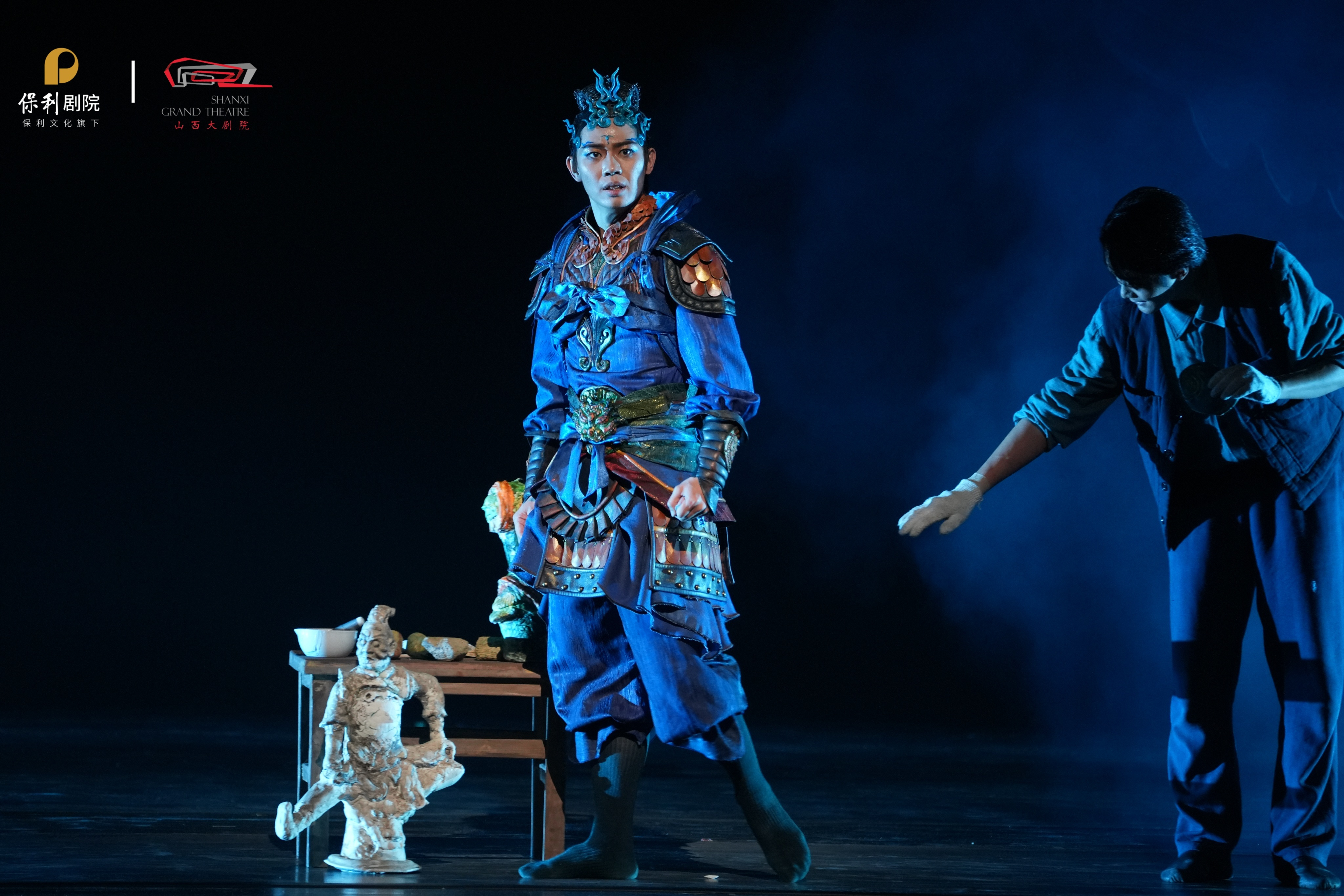 演出中,元代督建者与当代建筑师、被拒之门外的元代女画工与当代临摹者、执着复原孔雀蓝釉的匠人与七百岁的“蓝釉角神”跨越时空的对话,讲述了一个关于抉择、热爱与坚守的动人故事。
