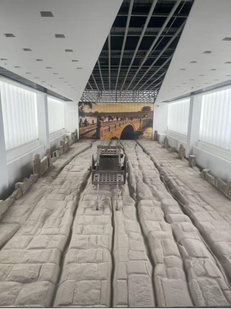 此次揭露的镇远桥为黄砂岩条石砌筑的单孔拱桥,造型古朴,结构稳固。桥体残长22米,宽17米,拱高3.5米,保存有桥拱、桥身、雁翅驳岸等部分。桥面清晰保留有四道深浅不一的车辙痕迹,其中最深处达10厘米,见证了明清时期太原城商旅络绎、车马穿行的繁盛景象。