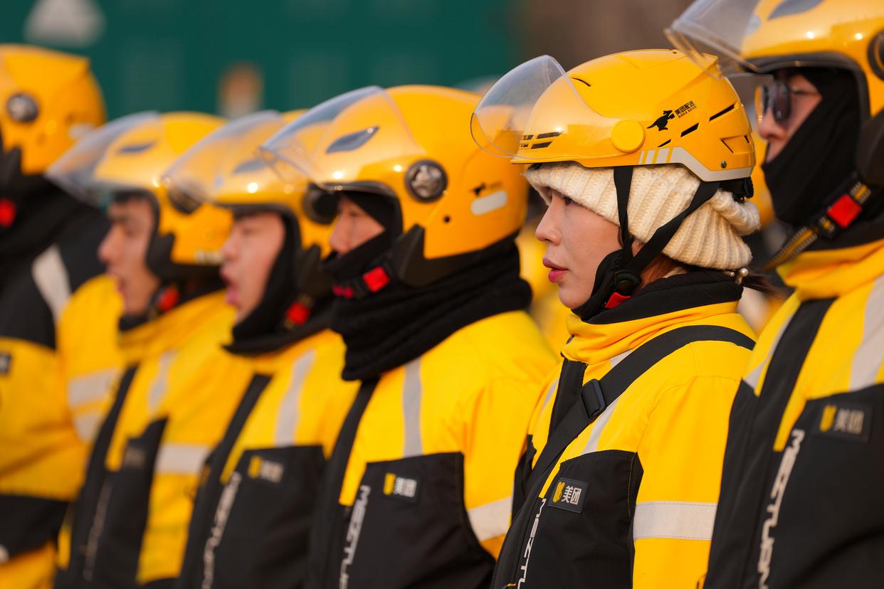 戚德敏(右二)在位于山西省太原市小店区的美团配送合作商服务中心参加早会(1月29日摄)。新华社记者 杨晨光 摄