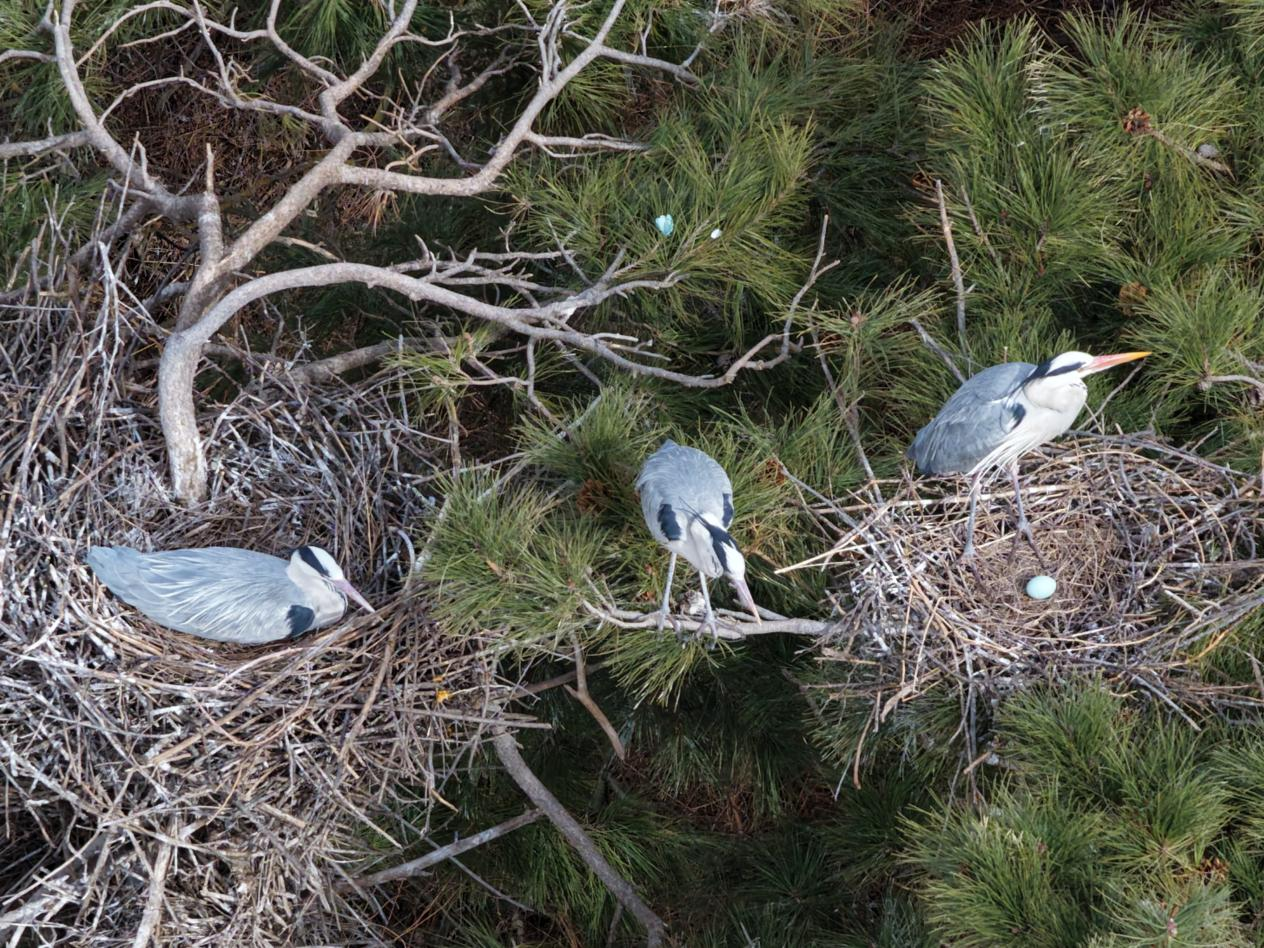 走进刘家庄村的苍鹭栖息区,可以看到鸟巢中卧着专心孵蛋的苍鹭,它们微微收拢脖颈,将腹部紧紧贴在鸟蛋上,用自身的体温为胚胎发育提供庇护。