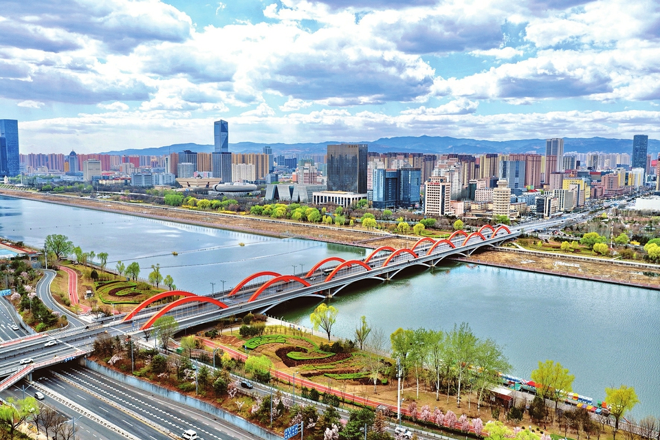 4月16日,俯瞰太原市汾河景区漪汾桥段,橙红拱肋横跨碧波之上,与蓝天碧水相映成趣,两岸草木葱茏、景致宜人,尽显生态之美。(记者王瑞瑞摄)