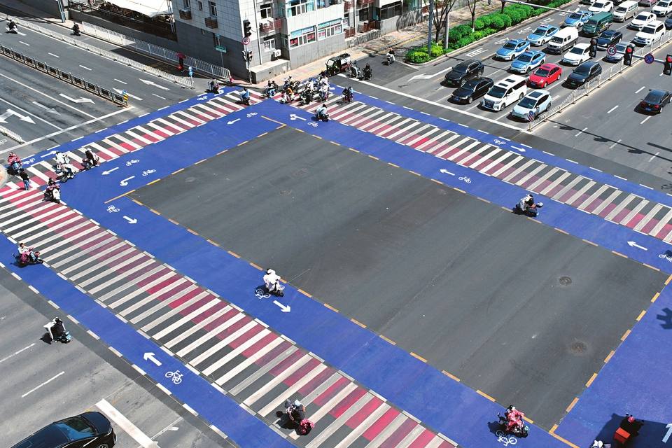 4月17日,太原市学府街坞城中路口,新增设的“蓝道”人车分流斑马线启用,有效提升了路口整体通行效率。(王若渊摄)