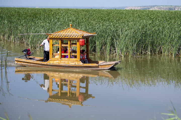 游客乘船在大同桑干河国家湿地公园游览。(新华每日电讯记者杨晨光摄)