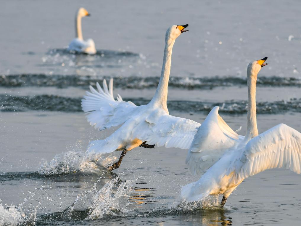 在山西平陆黄河湿地,大天鹅在嬉戏。