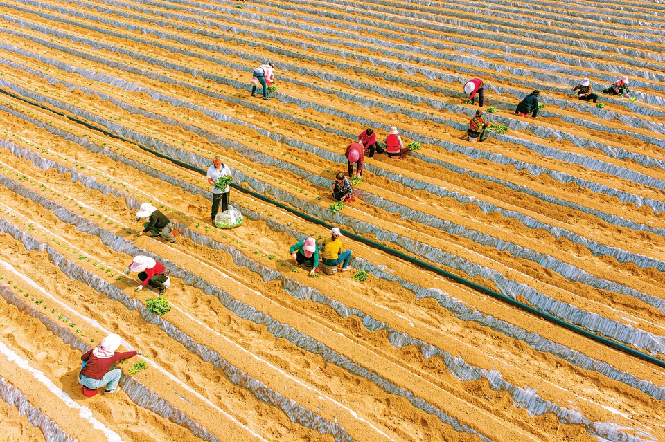 "(杨建峰摄)在平定县巨城镇移穰村桃河南岸的400余亩水浇田地上,村民们抢抓农时,整地播种。"